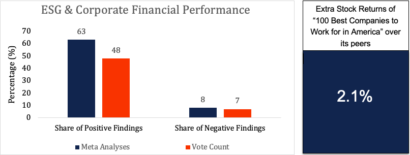 An aggregation of more than 2000 studies by Gunnar Friede, Timo Busch & Alexander Bassen in 2015 shows, approximately 90% of the studies find a non-negative correlation of ESG with corporate financial returns, of which 48% in vote-count studies and 63% in meta-analyses. In another study by Alex Edmans, Professor at Wharton School, University of Pennsylvania, shows that “100 Best Companies to Work For in America” earned an extra average of 2.1% a year in stock returns over its peers from 1984-2009.