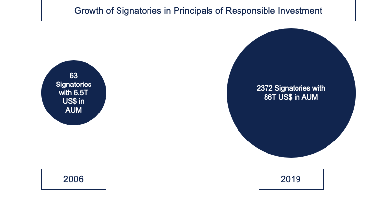 The recognition of higher financial return by investing in more sustainable businesses led to a dramatic rise in ESG investing since 2005. In early 2005, a multi-institutional group was formed, on the invitation by the then Secretary-General Kofi Annan, to create a set of Principals for Responsible Investment, PRI. It is currently the world’s leading proponent of responsible investment. The mission of the PRI is to help the financial system navigate the Principals and help them in implementing to create long-term value for investors and society. Since its inception in 2005, the number of institutional signatories has increased from 63 in 2006 to 2372 in 2019 with a CAGR of 32% and the total assets under management grew from 6.5T US$ in 2006 to 86T US$ in 2019 with CAGR of 22%.